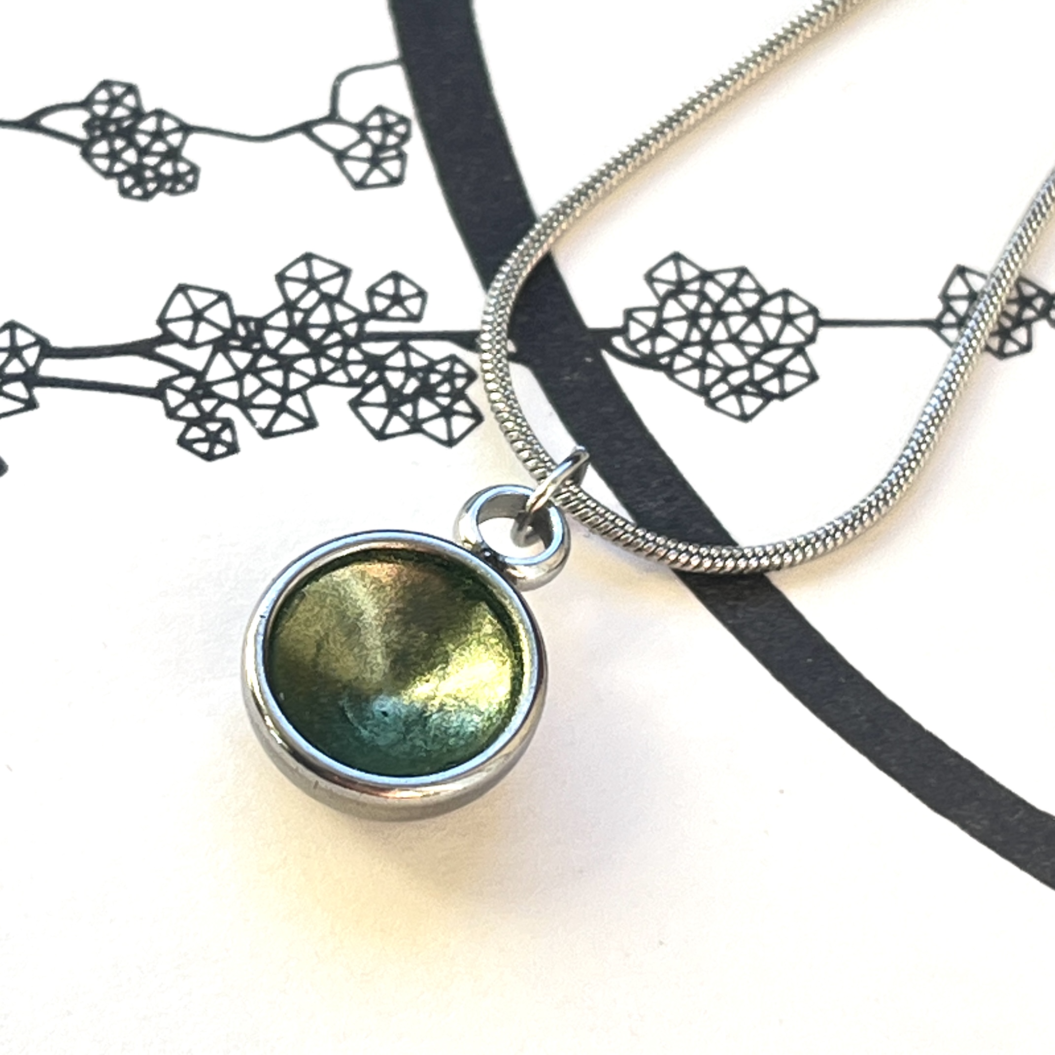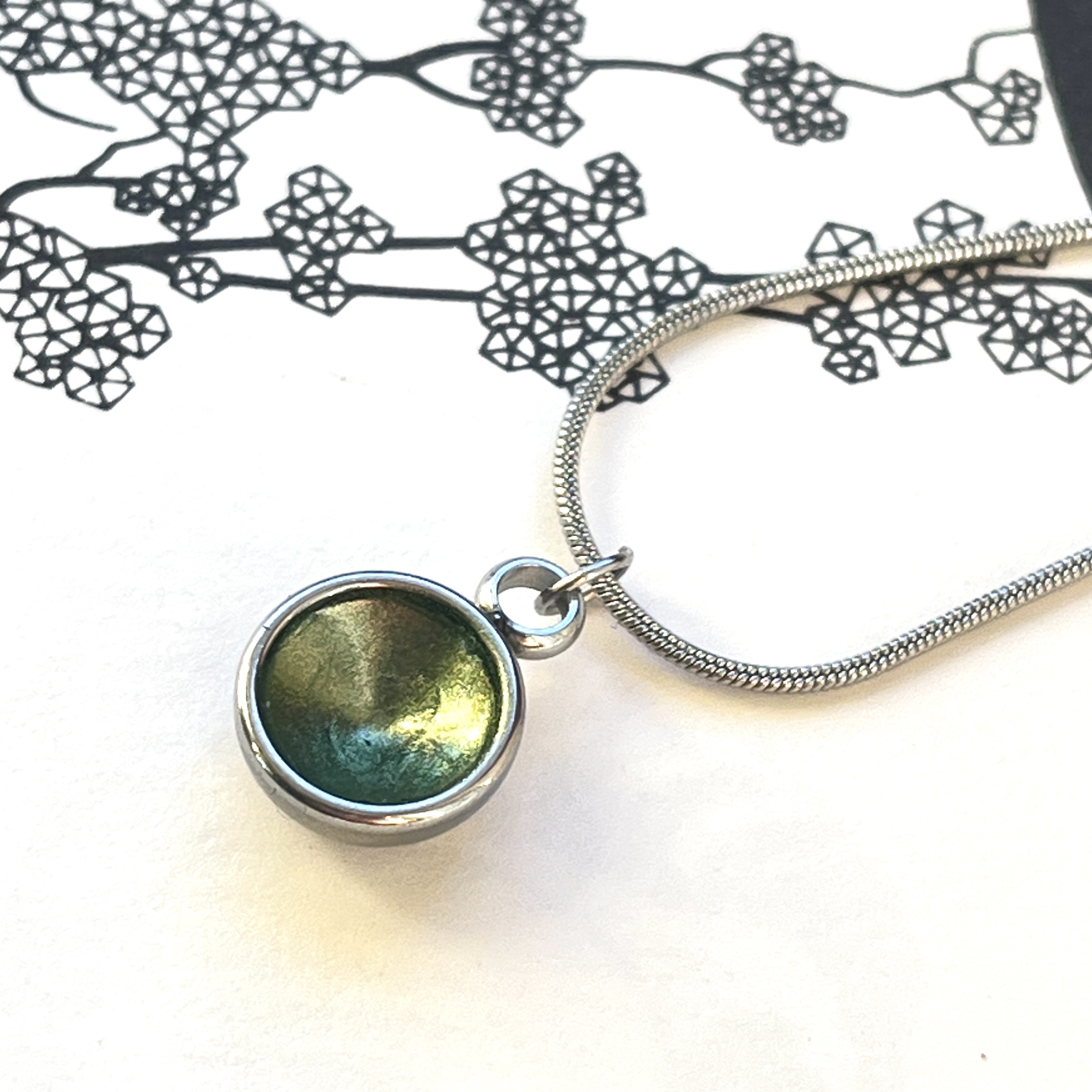 Preview: Zierlicher Schalenanhänger mit metallic oliv Kontrastfarbe – Edelstahl – inklusive Kette
