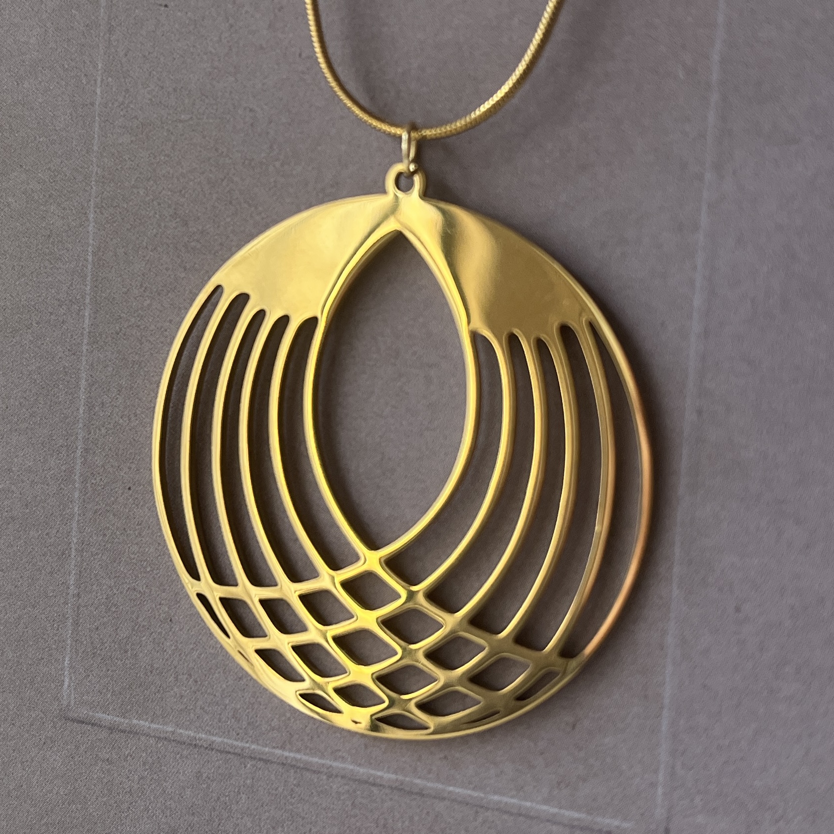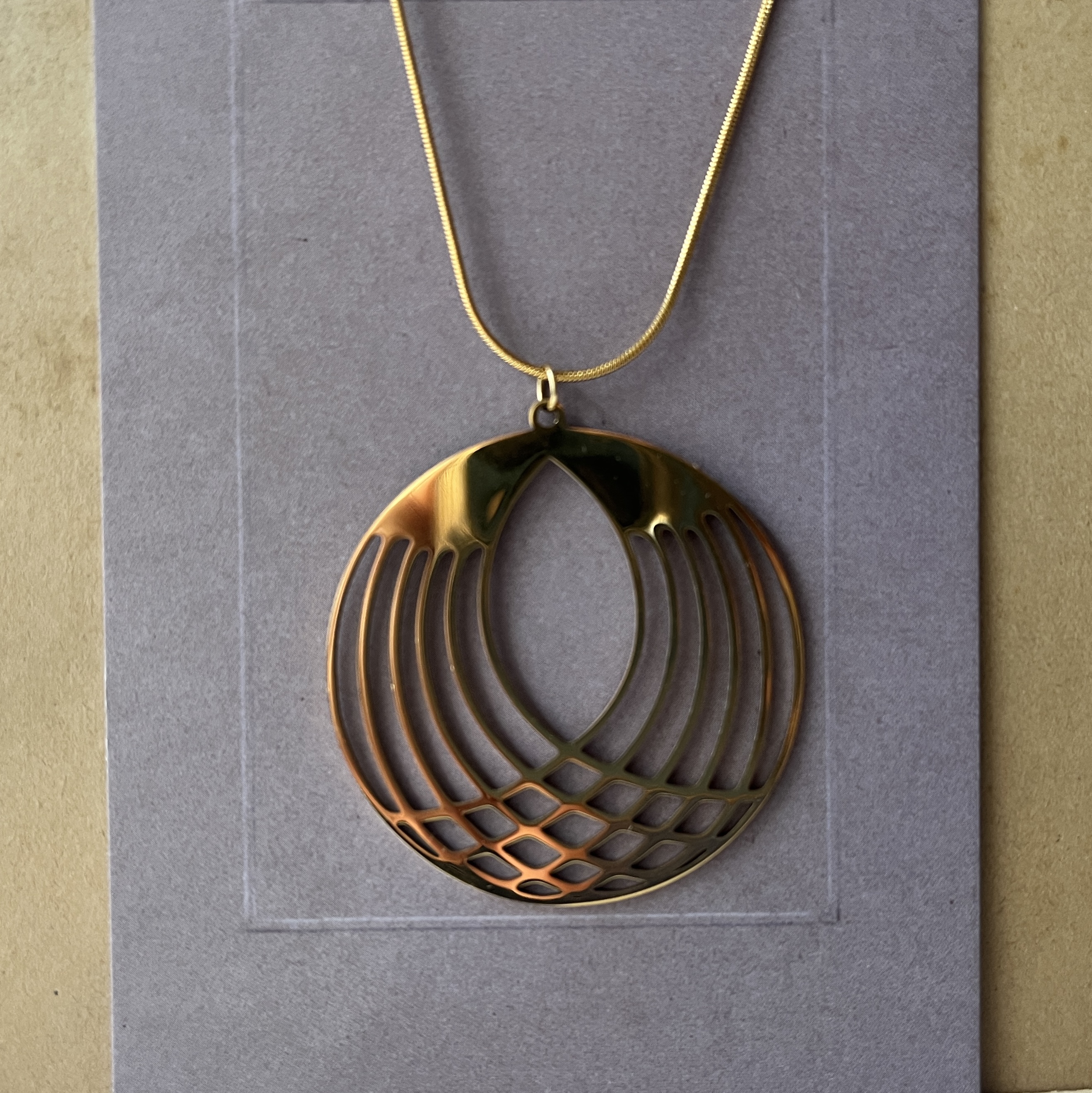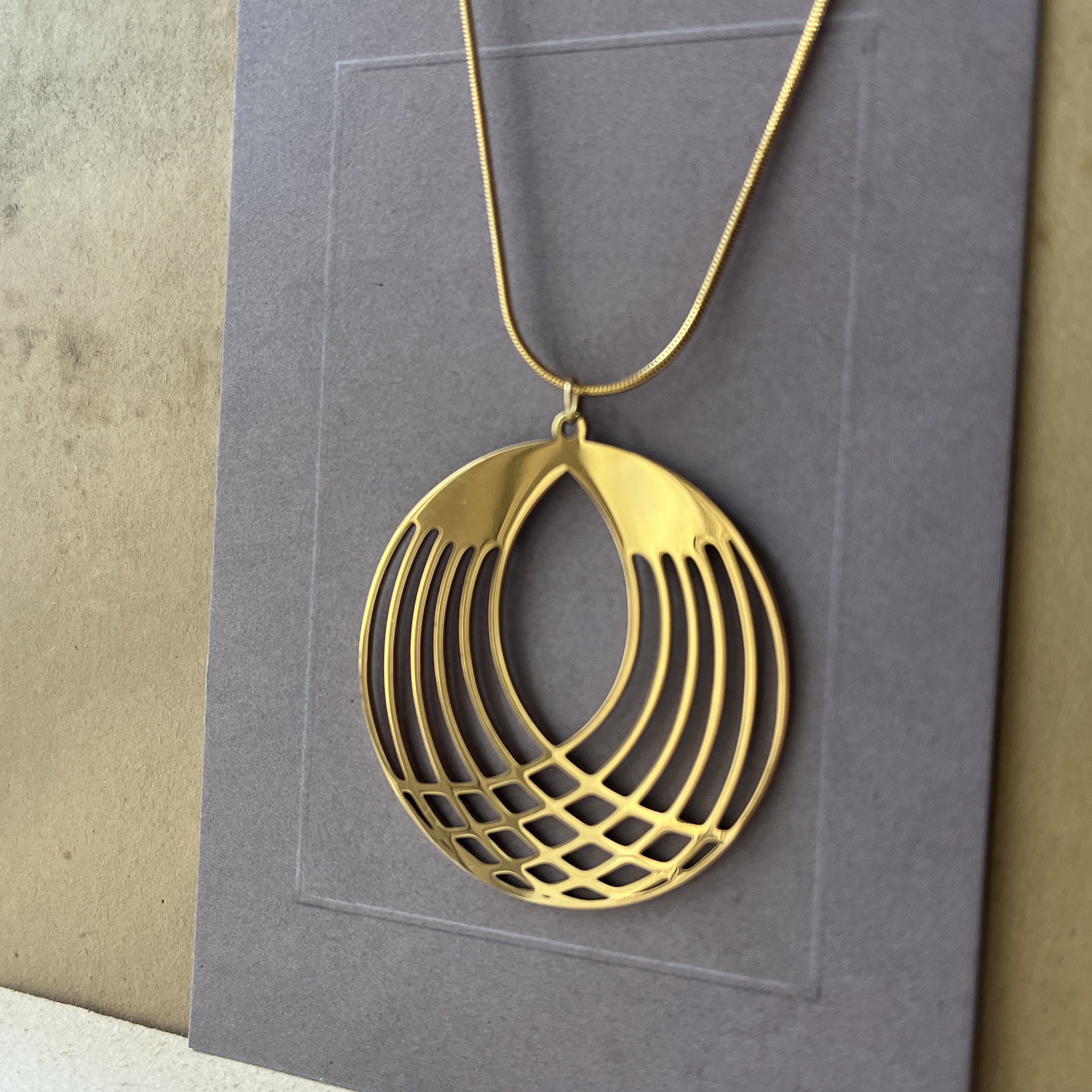 Dieser elegante Anhänger ist aus hochwertigem, vergoldetem Edelstahl gefertigt, inklusive einer filigranen Kette. Das geometrische, stilisierte Muster des Anhängers ist inspiriert von Art Déco und Jugendstil, erinnert an Wellen und grafische Netzstrukturen.
