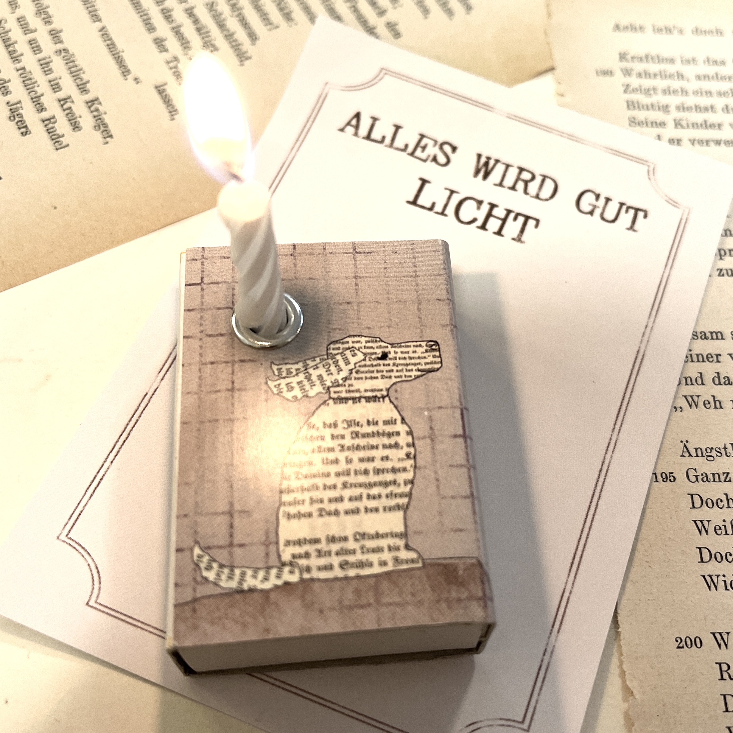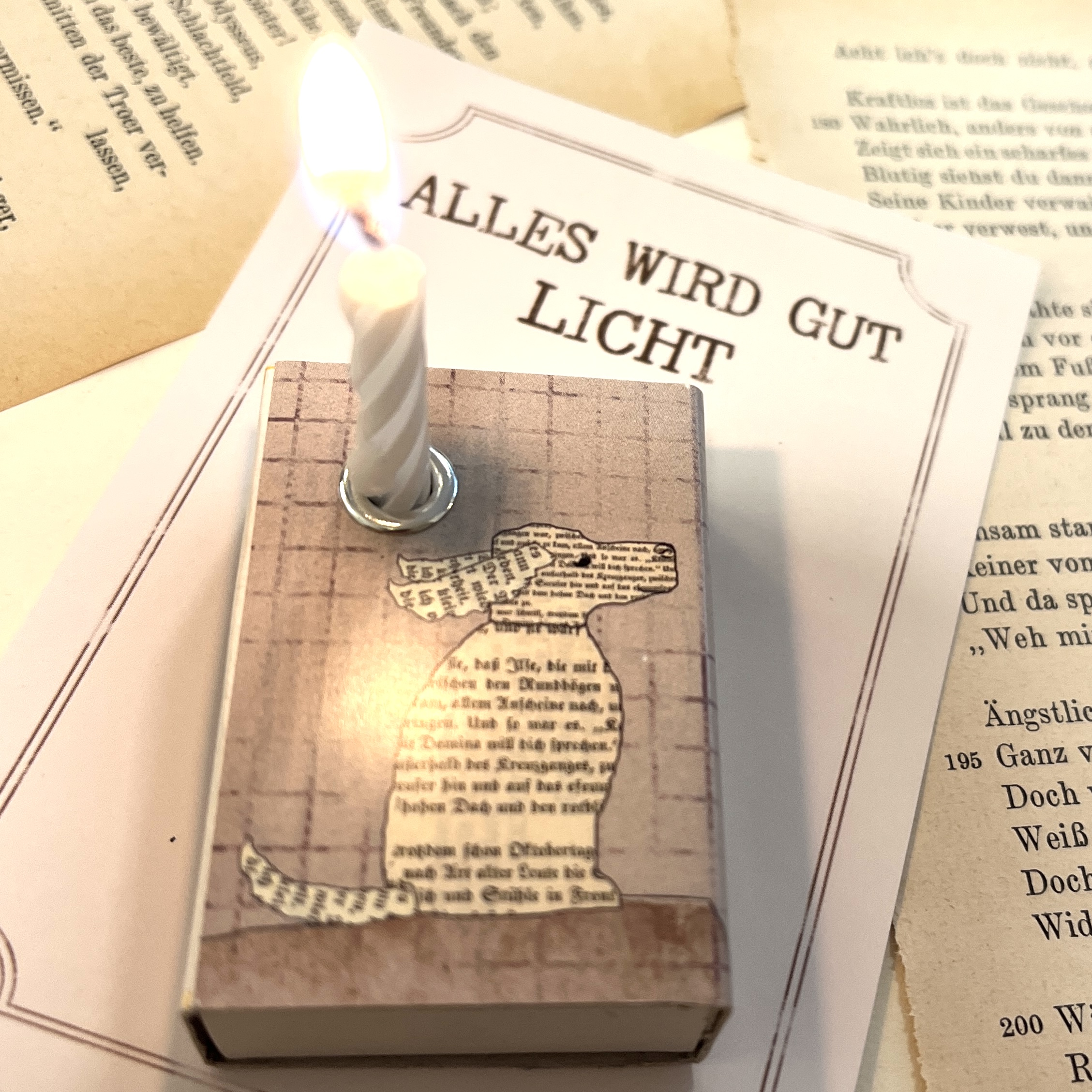 Das Schachtellicht besteht aus einer mit Streichhölzern gefüllten Streichholzschachtel, einer kleinen Kerze und einer kleinen Karte, die genügend Platz für einen Gruß bietet. Alles zusammen steckt in einer wiederverschliessbaren Tüte, so dass man vor dem Verschenken noch einen Gruß auf die Karte schreiben kann. Alles in allem: das perfekte Mitnehm-Geschenk.